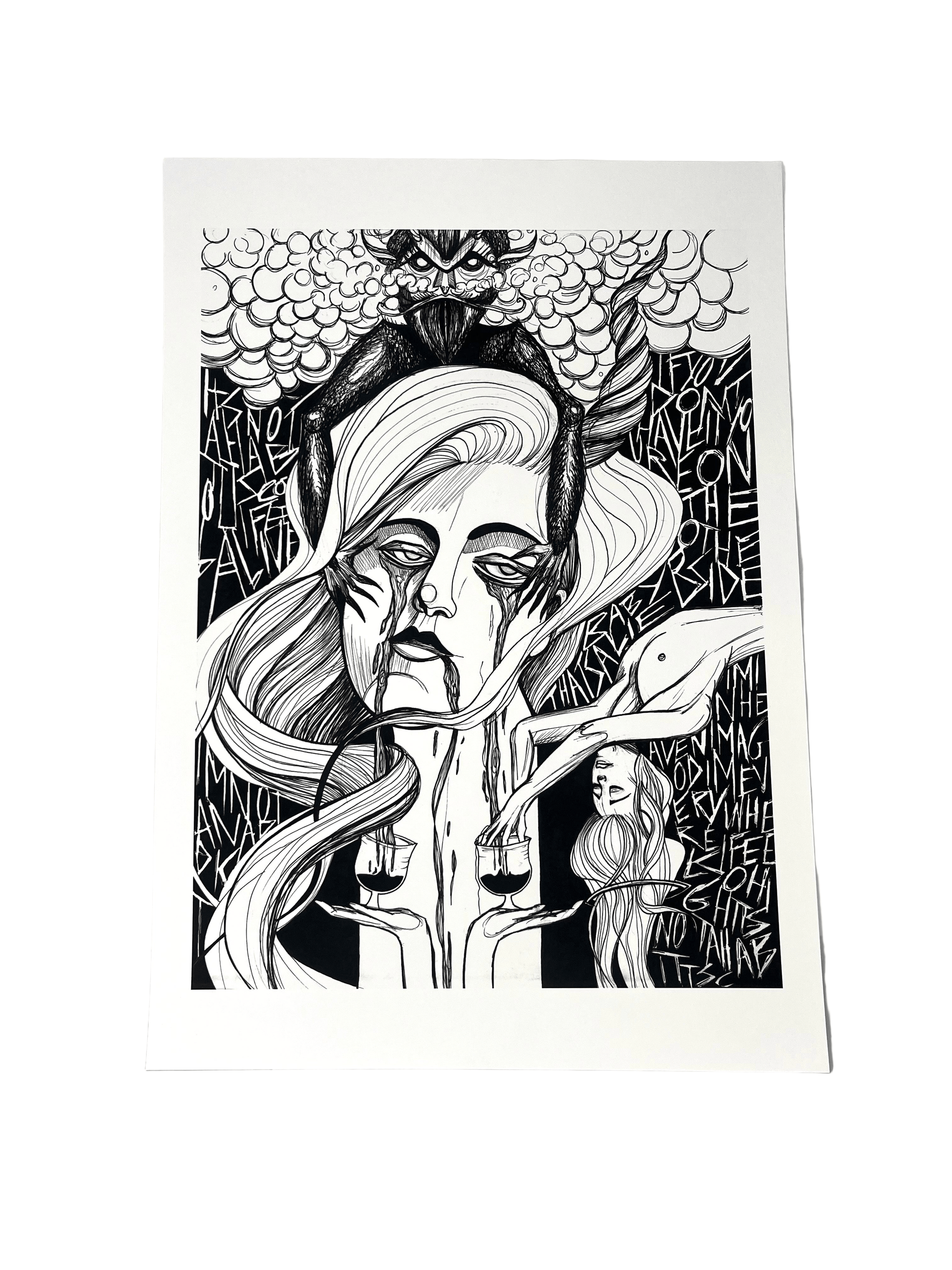 "Fikill" is a black & white piece built on sharp contrasts - light against darkness, escape against reality. The work touches on cycles of temptation and the presence of a shadow that never fully disappears. Printed in high quality on archival paper, each copy is signed and limited in stock.