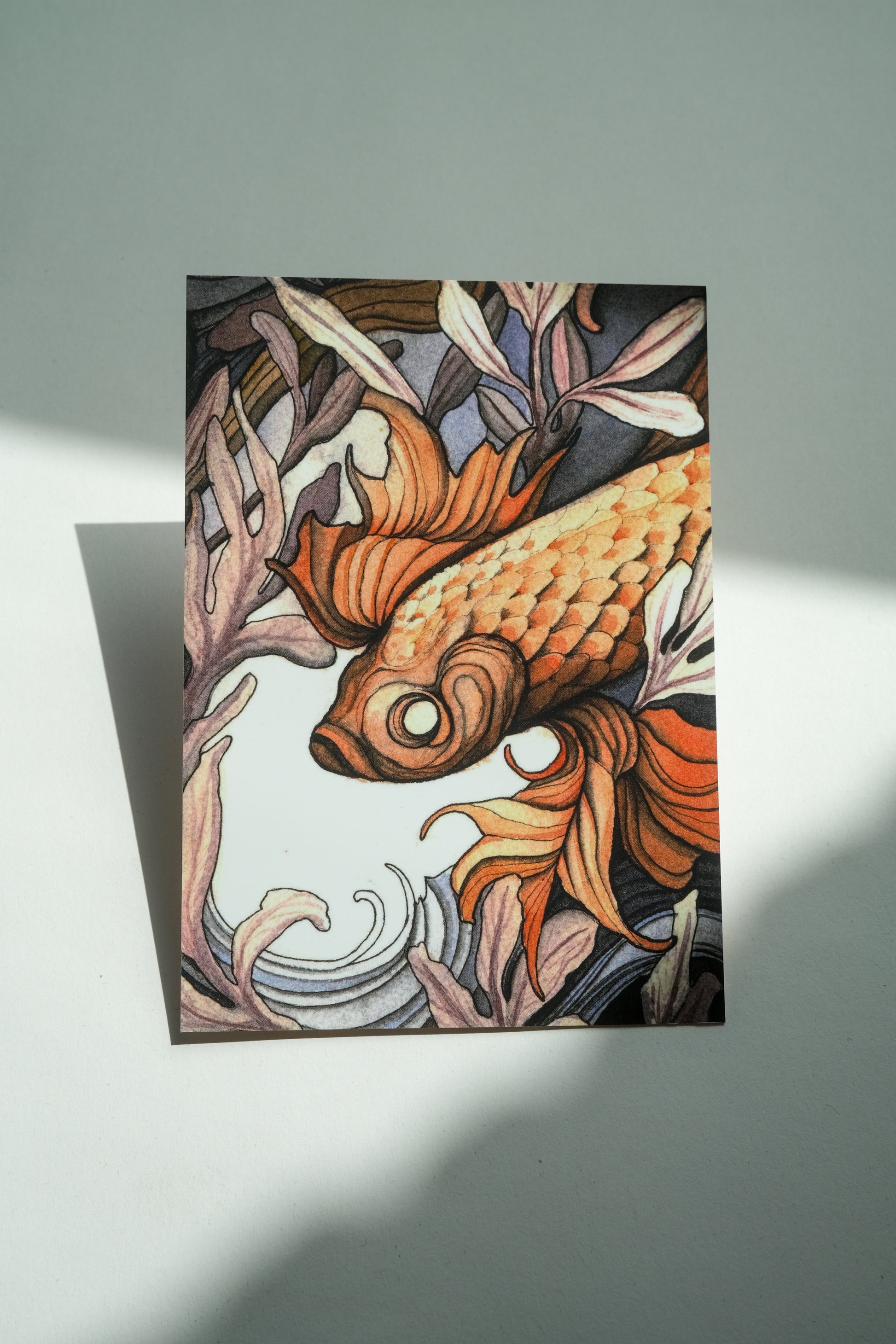 Dive into the elegance of the deep sea with this orange fish design, capturing movement and grace. Printed on premium 350gsm card with a soft-touch laminated front, and a writable back complete with address lines and stamp box — perfect for sending, framing, or collecting.